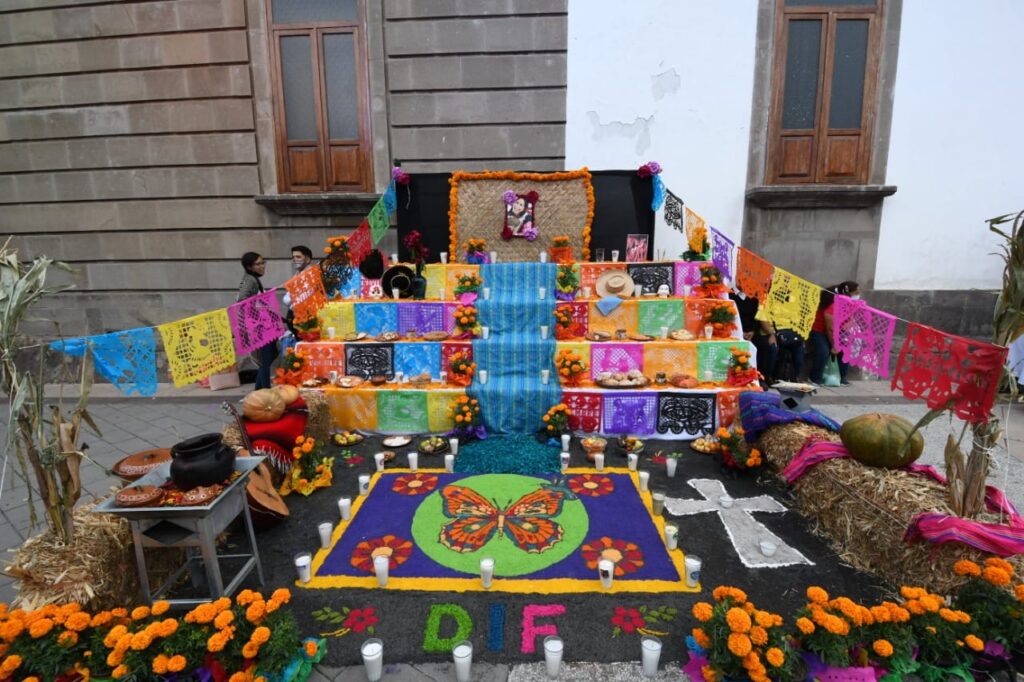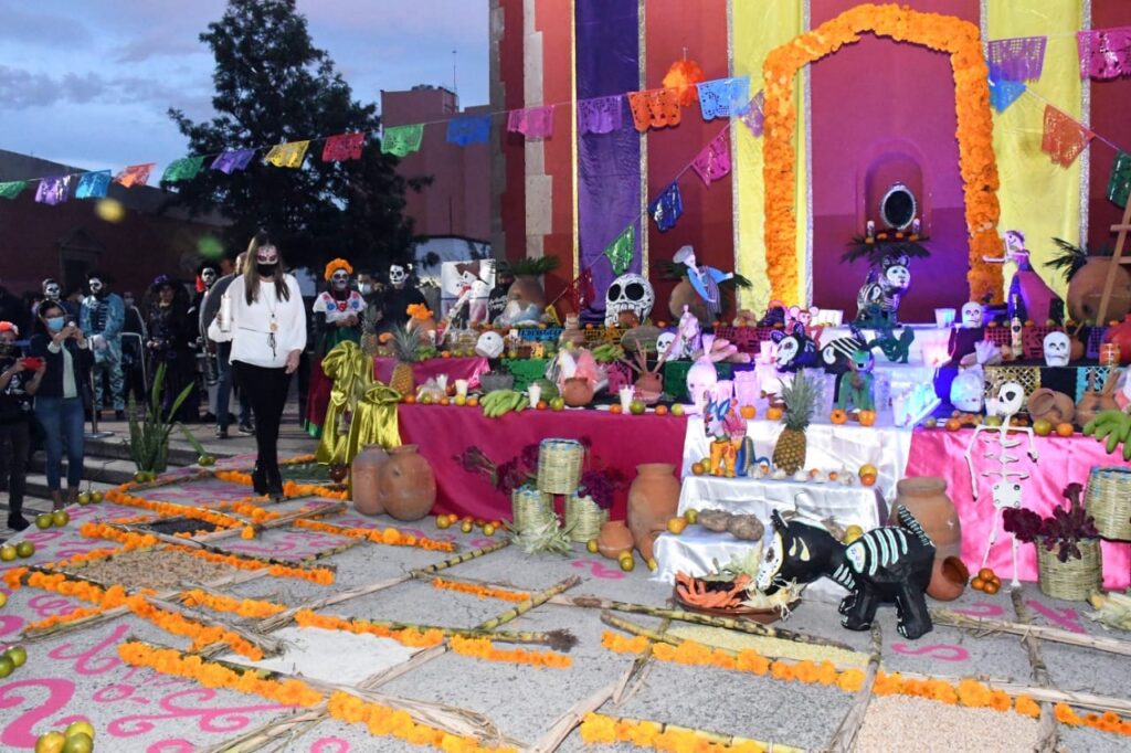 Irapuato, Gto. 1 noviembre 2021. Con el encendido del Altar de Muertos en el Ágora del Hospitalito, dieron inicio las actividades del V Festival ‘Reviviendo Las Tradiciones’, que concluirá el 5 de noviembre en el Centro Histórico.