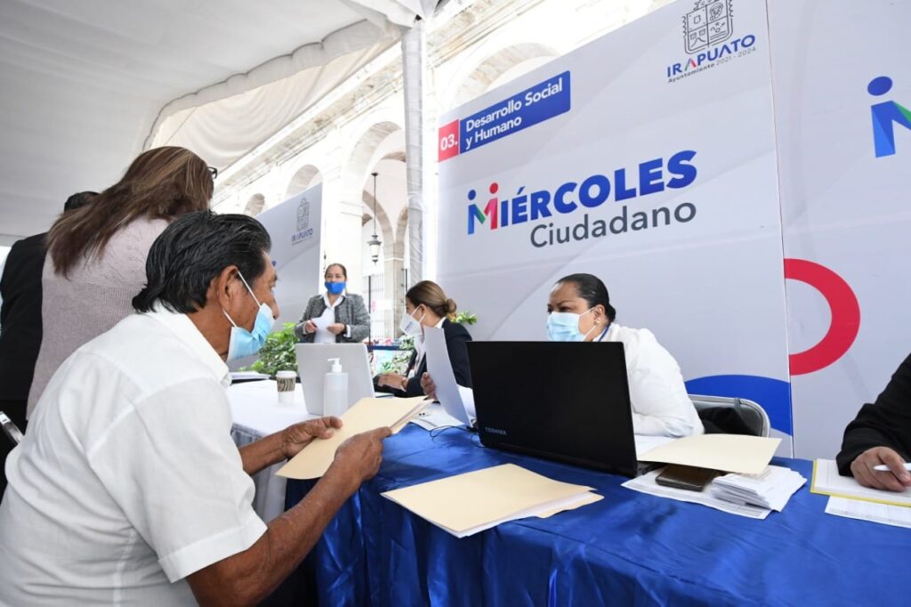 El patio de la Presidencia Municipal, en el Centro Histórico, es la sede del programa, que reúne a personal de más de 16 dependencias generales y organismos descentralizados de la Administración Pública 2021-2024, para conocer, atender y dar solución a problemáticas e inquietudes de las y los irapuatenses.