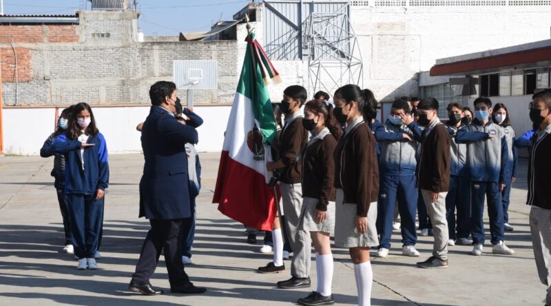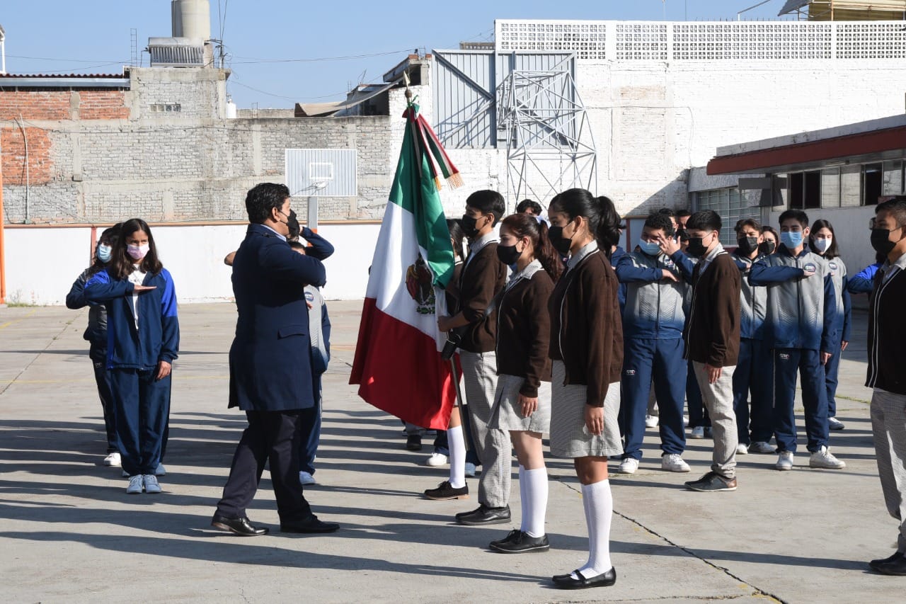 Irapuato, Gto. 17 enero 2022. Para fortalecer la identidad como mexicanos, entre las y los jóvenes de la escuela Secundaria Técnica N° 5, Guillermo Soto Fierro, el Gobierno Municipal realizó el acto cívico en compañía de estudiantes, docentes y padres de familia.
