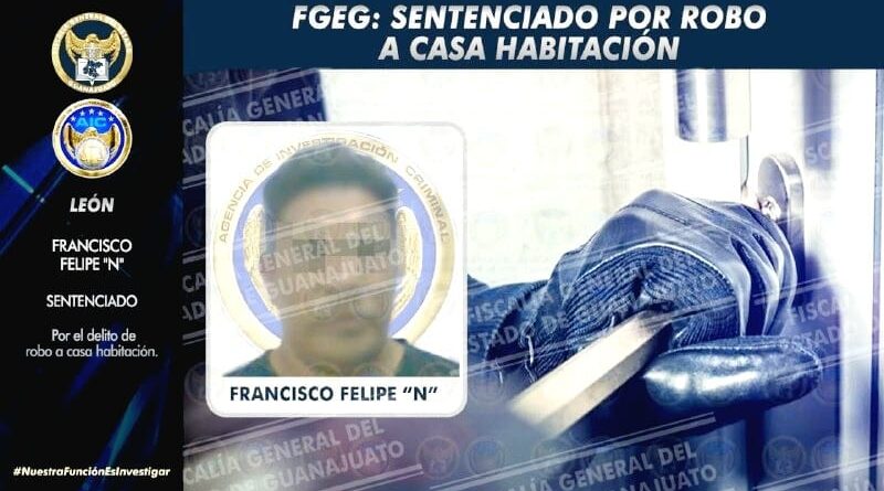 León, Gto. 10 febrero 2022. Un agente del Ministerio Público de la Fiscalía General del Estado, adscrito a la Unidad Especializada en Robo Casa habitación, obtuvo que Francisco Felipe “N”, fuera sentenciado a 7 años con 6 meses en prisión, además de negarle los beneficios y sustitutivos de la pena.