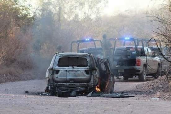 Tras el tiroteo se aseguraron cinco camionetas, dos de ellas quedaron quemadas, así como dos armas largas, entre ellas una mini ametralladora y poco más de 10 mil cartuchos de distintos calibres.