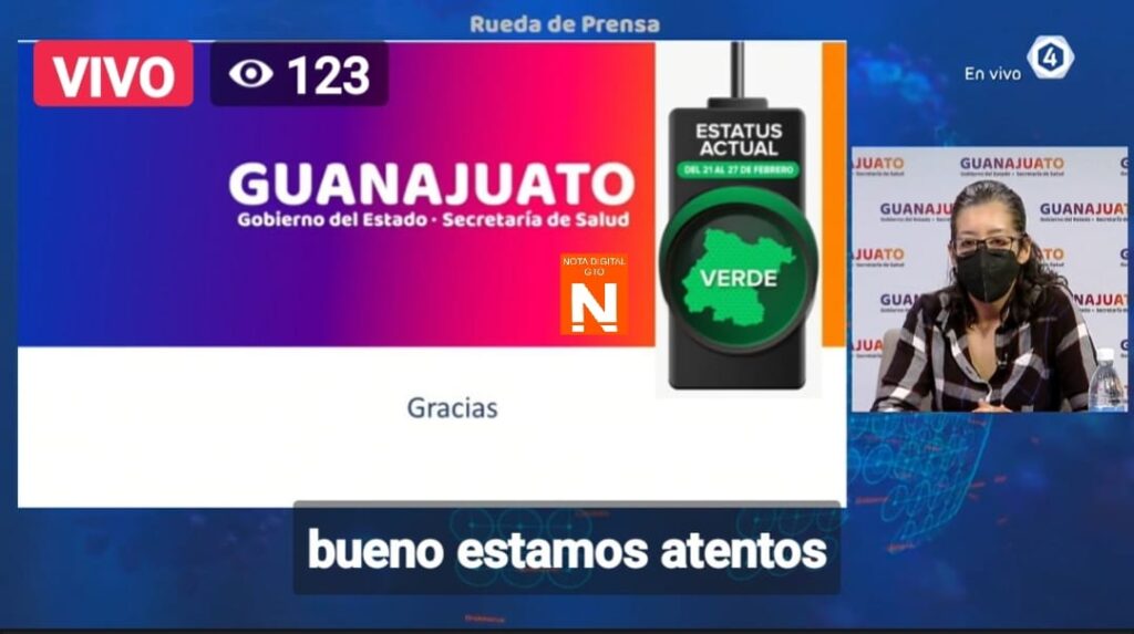 Guanajuato, Gto. 18 febrero 2022. Guanajuato cambia a color verde en el semáforo de reactivación económica a partir del 21 y hasta el 27 de febrero de este 2022, anunció la jefa Estatal de Epidemiología, la Dra. Fátima Melchor Márquez, en representación del Dr. Daniel Díaz Martínez, secretario de salud del Estado.