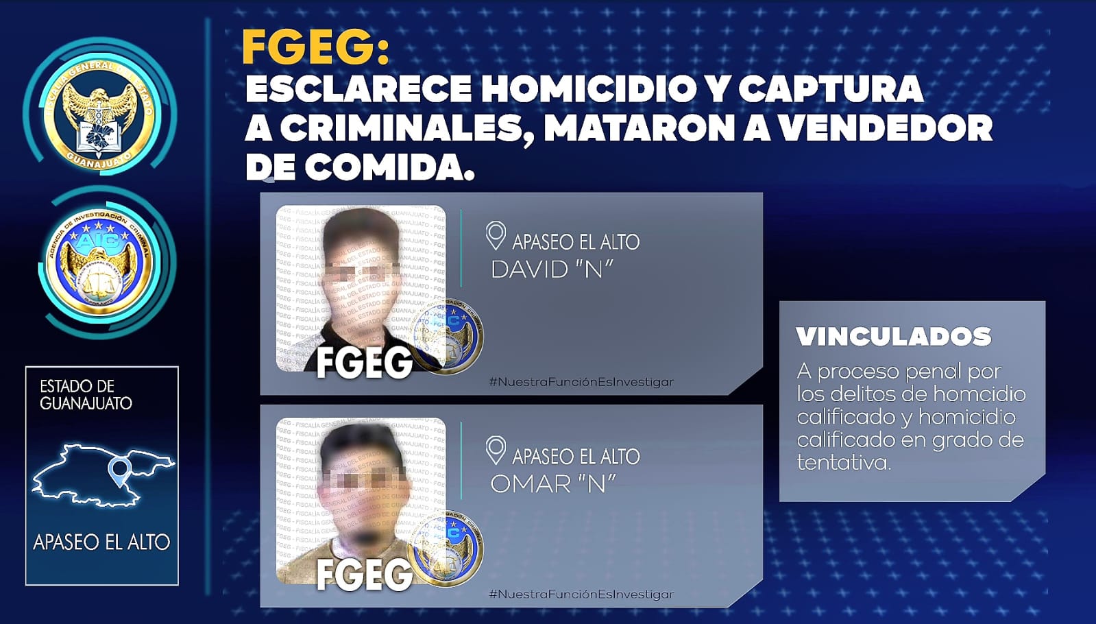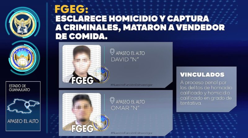 Apaseo el Alto, Gto., 23 abril 2022. Un hombre que atendía un establecimiento de comida denominado “Barbacoa El Muñeco”, fue ejecutado a balazos en vía pública en el municipio de Apaseo el Alto. La Unidad de Homicidios logró la detención con orden judicial de dos sujetos inculpados en dichos actos de violencia.