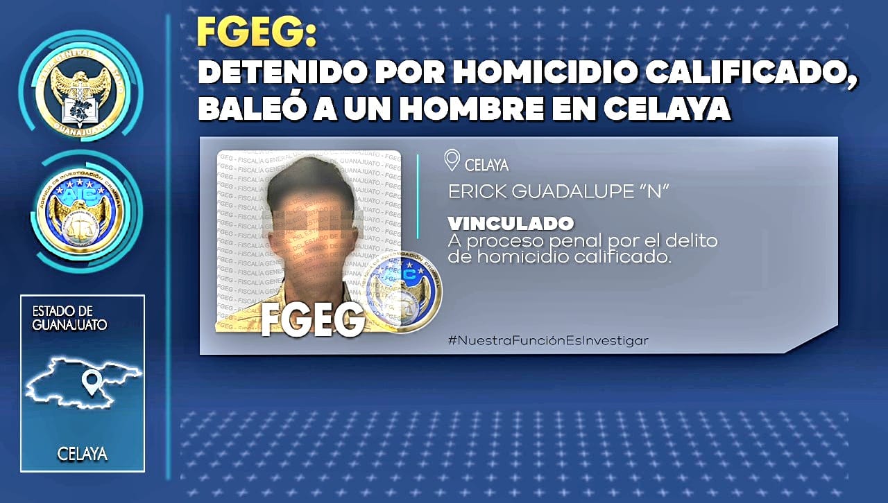 Celaya, Gto. 2 junio 2022. ERICK GUADALUPE “N” fue detenido como probable inculpado de disparar y asesinar a un hombre que se encontraba en la vía pública, en la colonia Emiliano Zapata, hechos por los que fue identificado y ubicado por la Fiscalía General del Estado, en razón de someterlo a un proceso penal por el delito de homicidio calificado, cometido en Celaya.