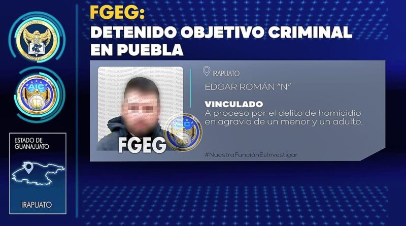 Irapuato, Gto. 14 junio 2022. Agentes de Investigación Criminal detuvieron a un sujeto de 27 años, considerado objetivo criminal, quien fue detenido con orden de aprehensión en una colonia de la Ciudad de Puebla. El presunto homicida huyó tras asesinar a un menor de 14 años y a un adulto de 30 años, el pasado 21 de mayo de 2021, en la colonia Plan Guanajuato.