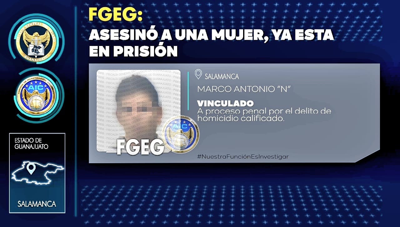Salamanca, Gto. 16 julio 2022. Un sujeto fue detenido por elementos de la Unidad especializada en Mandamientos Judiciales de la Fiscalía General del Estado, acusado de asesinar a una mujer de 33 años. Al acreditar el hecho que la ley señala como delito y la probabilidad del indiciado de que lo cometió o participó en su ejecución, se obtuvo su vinculación a proceso penal.