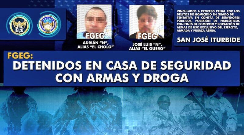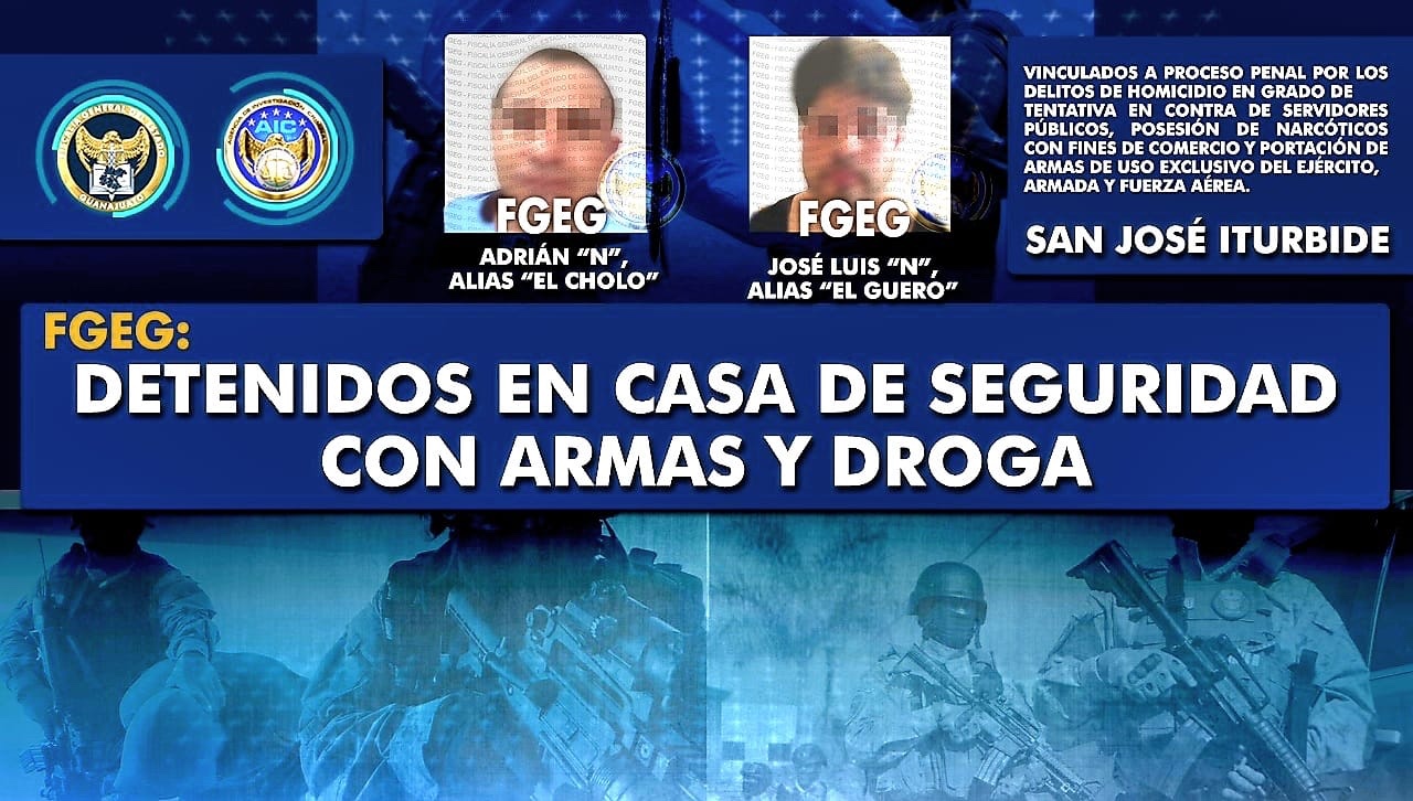 San José Iturbide, Gto. 20 agosto 2022. JOSÉ LUIS “N” alias “El Güero” y ADRIÁN “N” alias “El Cholo”, fueron sorprendidos y detenidos por elementos especiales de la Agencia de Investigación Criminal en el interior de una casa de seguridad, ahí tenían armas de fuego y droga, se ubicaban en la comunidad La Llorona, en San José Iturbide.