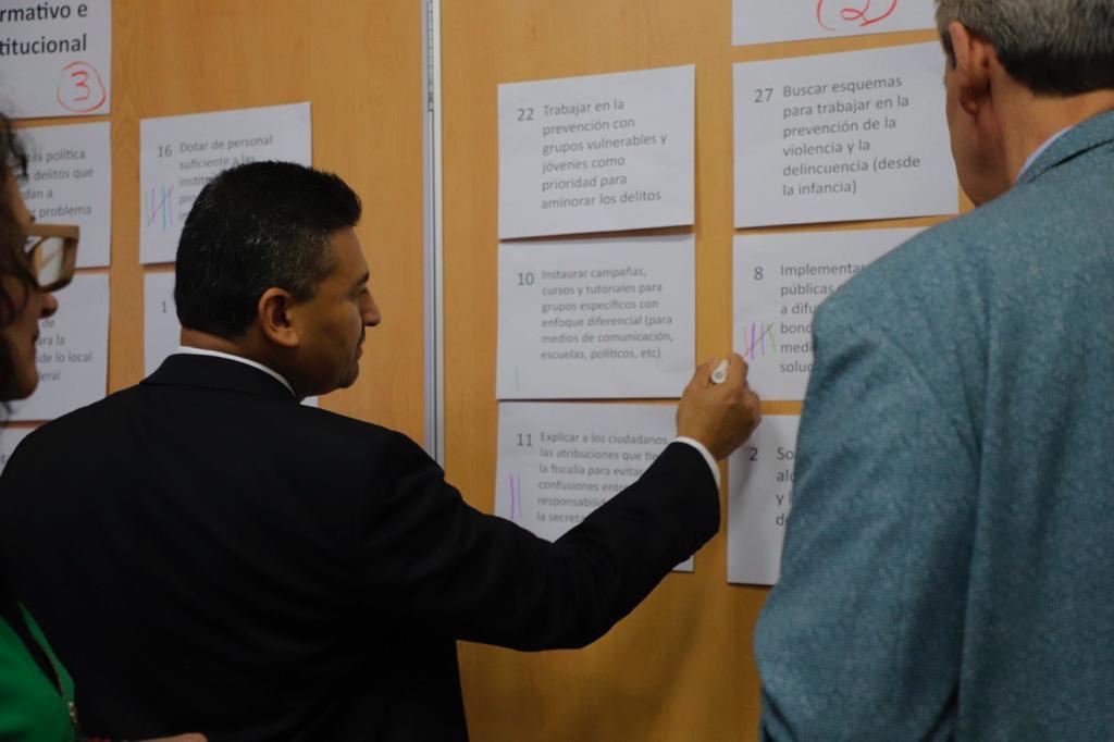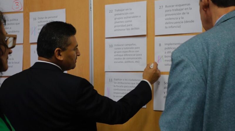 Reunidos en el edificio central del Complejo Miguel Hidalgo y Costilla de la Fiscalía de Guanajuato, el grupo organizador del taller sectorial conformado por Eduardo Sojo Garza-Aldape, Presidente del Observatorio INNOVA GOB; Héctor López Santillana, Director General de Guanajuato Puerto Interior; Graciela de la Luz Amaro Hernández, Directora General del Instituto de Planeación del Estado de Guanajuato (IPLANEG); Héctor Tinajero Muñoz, magistrado propietario del Supremo Tribunal de Justicia del Estado de Guanajuato; Gloria Jasso Bravo, Magistrada propietaria del Supremo Tribunal de Justicia del Estado de Guanajuato; Carlos Eduardo Castro Alcudia, Especialista en Sistema Penal Acusatorio, Bureau of International Narcotics and Law Enforcement Affairs (INL); María del Carmen Novoa Cancela, Lead Advisor of the Mexican Laboratory of Innovation in Criminal Justice; Luis Antonio Alanís Villarreal, Ex presidente del Consejo Externo de Consulta de la FGEG.