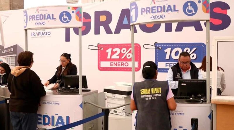Irapuato, Gto. 2 enero 2024. El pago del predial 2024 inició y este año la sede principal es en el patio de la Presidencia Municipal y durante enero, habrá un descuento del 12% por pronto pago.