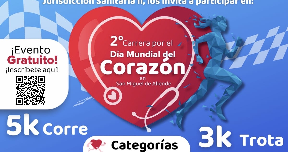 La Comisión Municipal del Deporte y el Programa de Enfermedades Cardiometabólicas de la Jurisdicción Sanitaria II invitan a la comunidad a participar en la 2ª Carrera en conmemoración del Día Mundial del Corazón, que se llevará a cabo el próximo 27 de septiembre en el Parque Zeferino Gutiérrez del municipio de San Miguel de Allende.