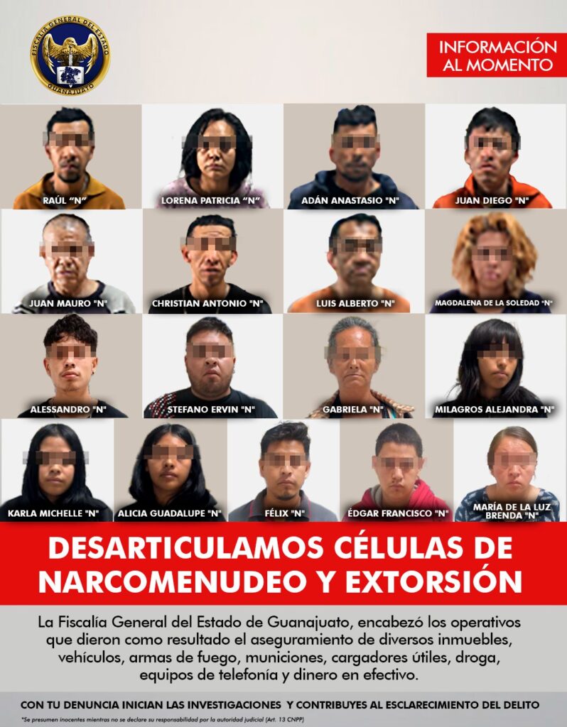 Guanajuato. 20 febrero 2025. La Fiscalía General del Estado de Guanajuato (FGEG), llevó a cabo una serie de operativos que permitieron la desarticulación de células criminales dedicadas al narcomenudeo y la extorsión en los municipios de León, San Francisco del Rincón, Irapuato y Celaya.