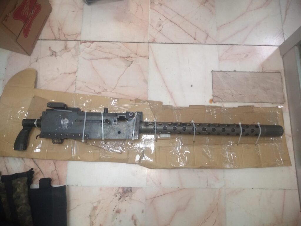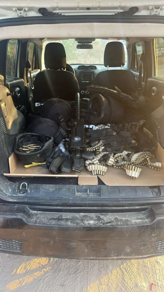 Por ello, al inspeccionar el automóvil aseguraron un arma de alto poder, cuatro cintas abastecidas con 353 cartuchos útiles calibre 7.62 mm, de uso común en fusiles automáticos y armas de guerra, 10 cargadores abastecidos calibre 7.62×39, siete cascos balísticos, siete chalecos balísticos con insignias del grupo delictivo y siete tocados tipo pixelado.