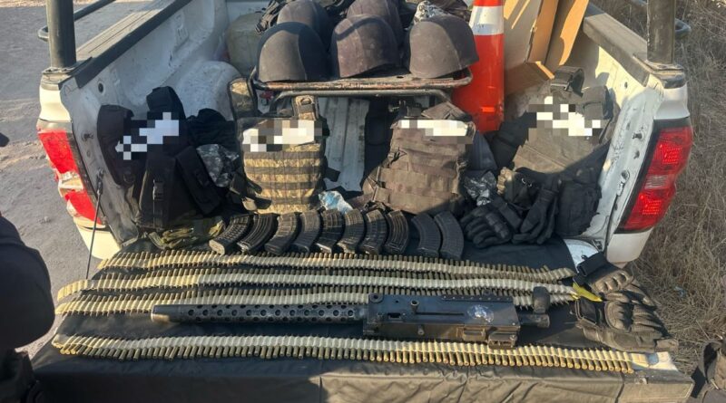 Durante la inspección visual, se detectó en su interior armamento y equipo táctico con siglas identificadas con un grupo criminal que opera en diversas regiones del país.