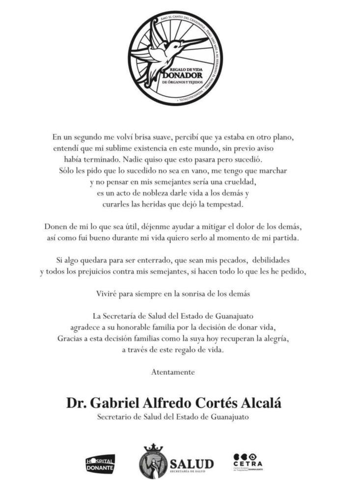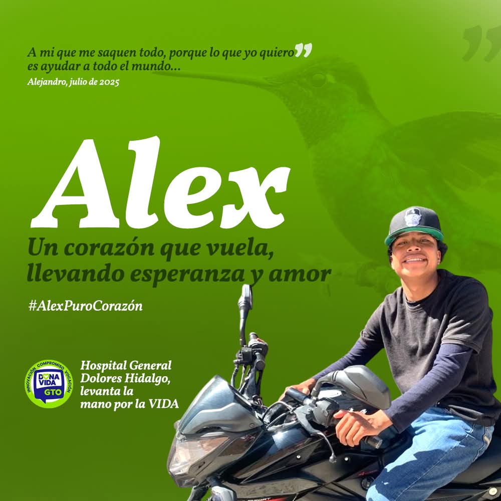 Guanajuato. 7 agosto 2025. Alex, joven guanajuatense con 17 años de edad, el 5° de 8 hermanos, originario de una comunidad llamada Tierra Prieta en Dr. Mora, Guanajuato, se convierte en un super héroe por la vida, ya que en su trascendencia regaló mucha esperanza en la donación de sus órganos para las personas que más lo necesitaban.