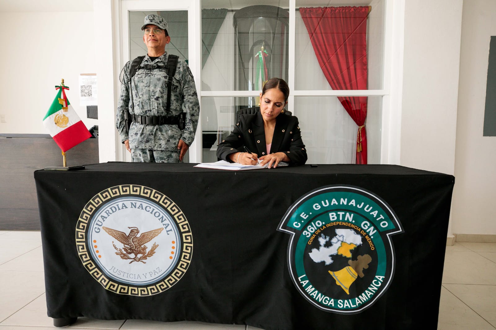 “Gracias a la Guardia Nacional por su estrecha colaboración en las labores de seguridad pública, que complementamos con una profunda visión de seguir haciendo equipo por la paz de México y de Guanajuato. Unidos en torno a un propósito común, lograremos la meta que nos hemos planteado, generar el mejor estado para nuestras hijas e hijos”, dijo Libia Dennise.