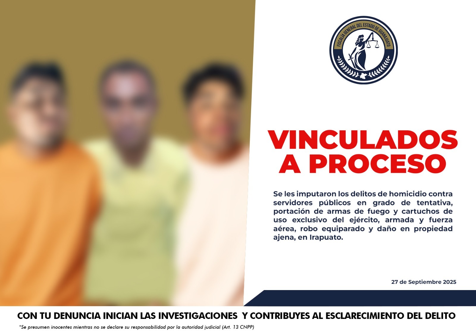 La Fiscalía General del Estado de Guanajuato recabó pruebas y obtuvo que tres presuntos criminales permanezcan en prisión, acusados de intentar asesinar a más de una decena de elementos de seguridad del ámbito estatal y federal, en el municipio de Irapuato.