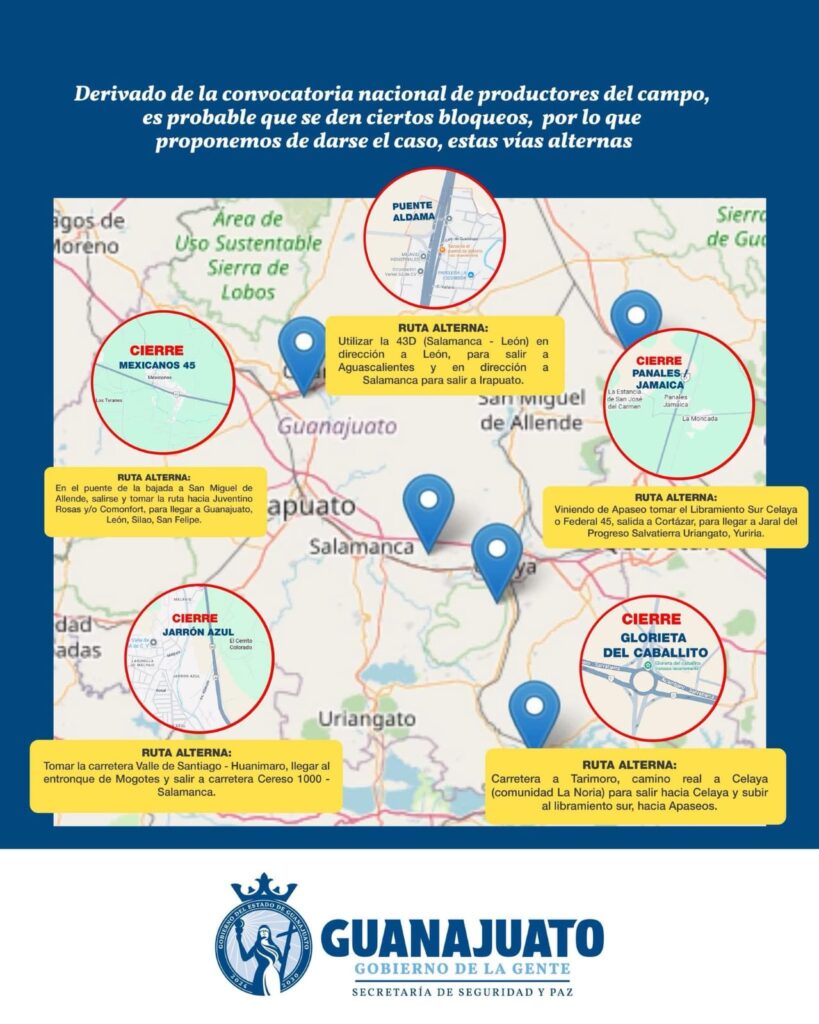 Por convocatoria nacional de productores del campo, podrían presentarse bloqueos en distintas carreteras federales y estatales dentro de Guanajuato. Planea tu ruta con anticipación y considera estas vías alternas.