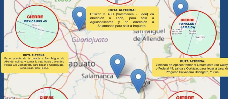 ✅ Ruta alterna: Dirígete hacia Tarimoro, luego toma el Camino Real a Celaya por la comunidad La Noria para salir al Libramiento Sur rumbo a los Apaseos.