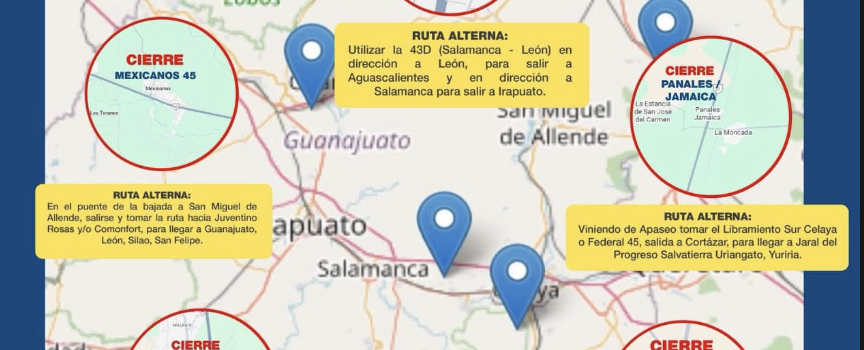 Por convocatoria nacional de productores del campo, podrían presentarse bloqueos en distintas carreteras federales y estatales dentro de Guanajuato. Planea tu ruta con anticipación y considera estas vías alternas.