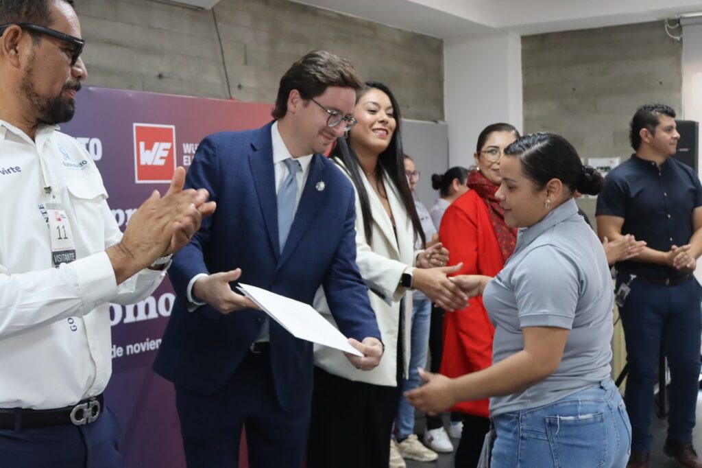Irapuato, Gto. 17 noviembre 2025. El Gobierno de la Gente, a través de la Secretaría de Economía entregó constancias a 11 mujeres de la empresa Würth que concluyeron con éxito su capacitación en Ensamble y Manufactura de Piezas Automotrices, a través del programa Bécat.