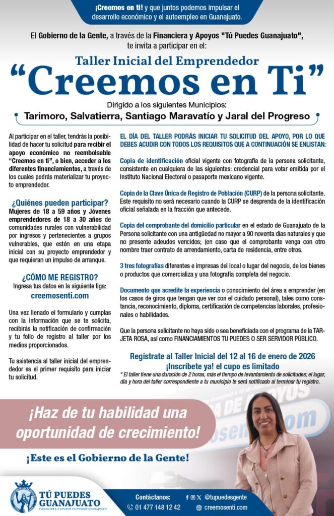 Silao, Gto. 14 enero 2026. En un esfuerzo por fortalecer el tejido económico de las comunidades más apartadas del estado, el Gobierno de la Gente, a través de la Financiera y Apoyos Tú Puedes Guanajuato lanzó la convocatoria del programa “Creemos en Ti” dirigida a municipios del Sureste del estado.